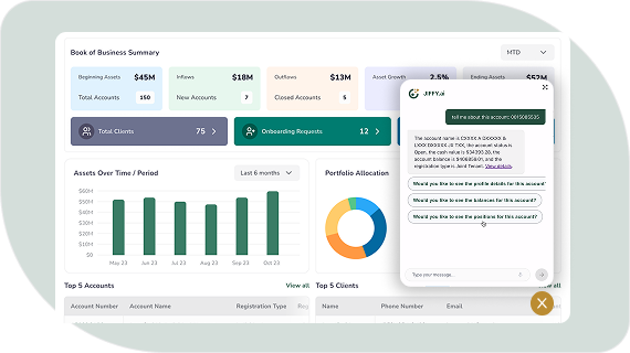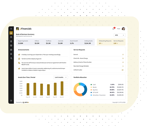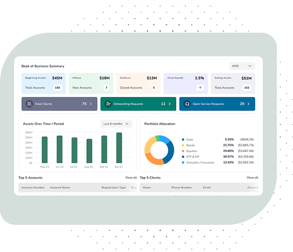 Our comprehensive dashboard empowers you to elevate client relations through actionable intelligence on books of business. From tracking asset growth to handling service requests, our solution ensures that you have everything you need to provide unparalleled service and insight, and foster lasting client trust.