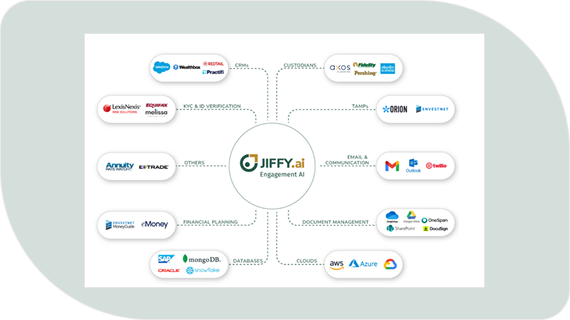 JIFFY.ai is pre-integrated with CRM, banking, mortgage, cards, wealth, loan and treasury systems.