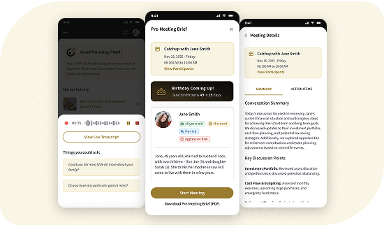 Prepares concise pre-meeting briefs, supports advisors during meetings with intelligent prompts, and automatically generates summaries and next steps.
