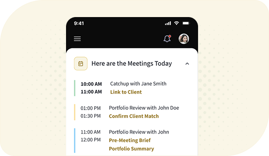 Helps advisors prioritize their day by organizing meetings, follow-ups, and client actions based on urgency and impact.