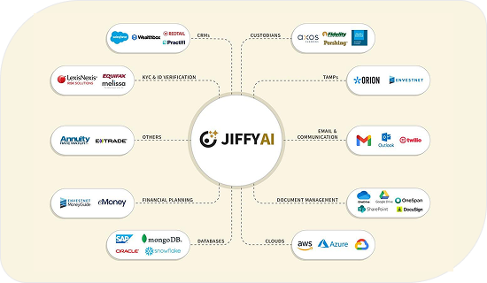 JIFFYAI is pre-integrated with CRM, banking, mortgage, cards, wealth, loan and treasury systems.