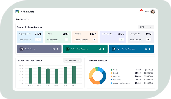 Our comprehensive dashboard empowers you to elevate client relations through actionable intelligence on books of business. From tracking asset growth to handling service requests, our solution ensures that you have everything you need to provide unparalleled service and insight, and foster lasting client trust.